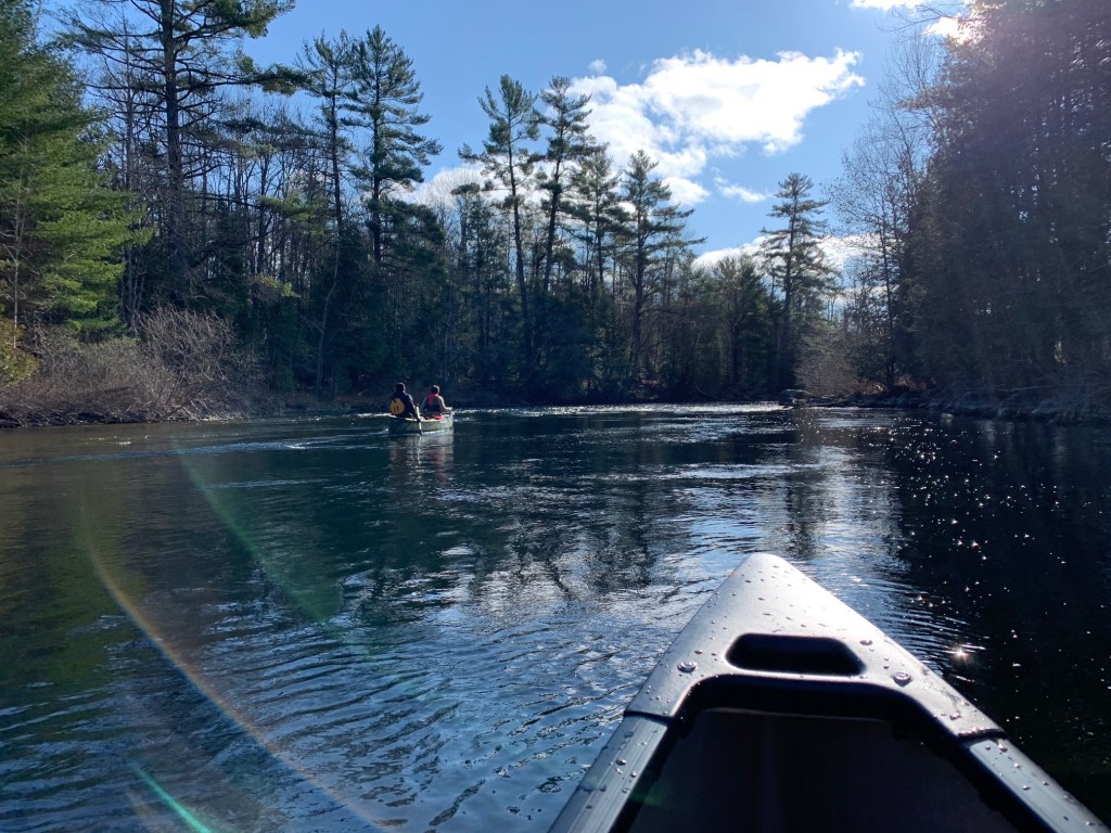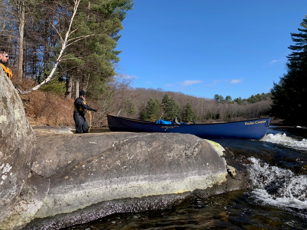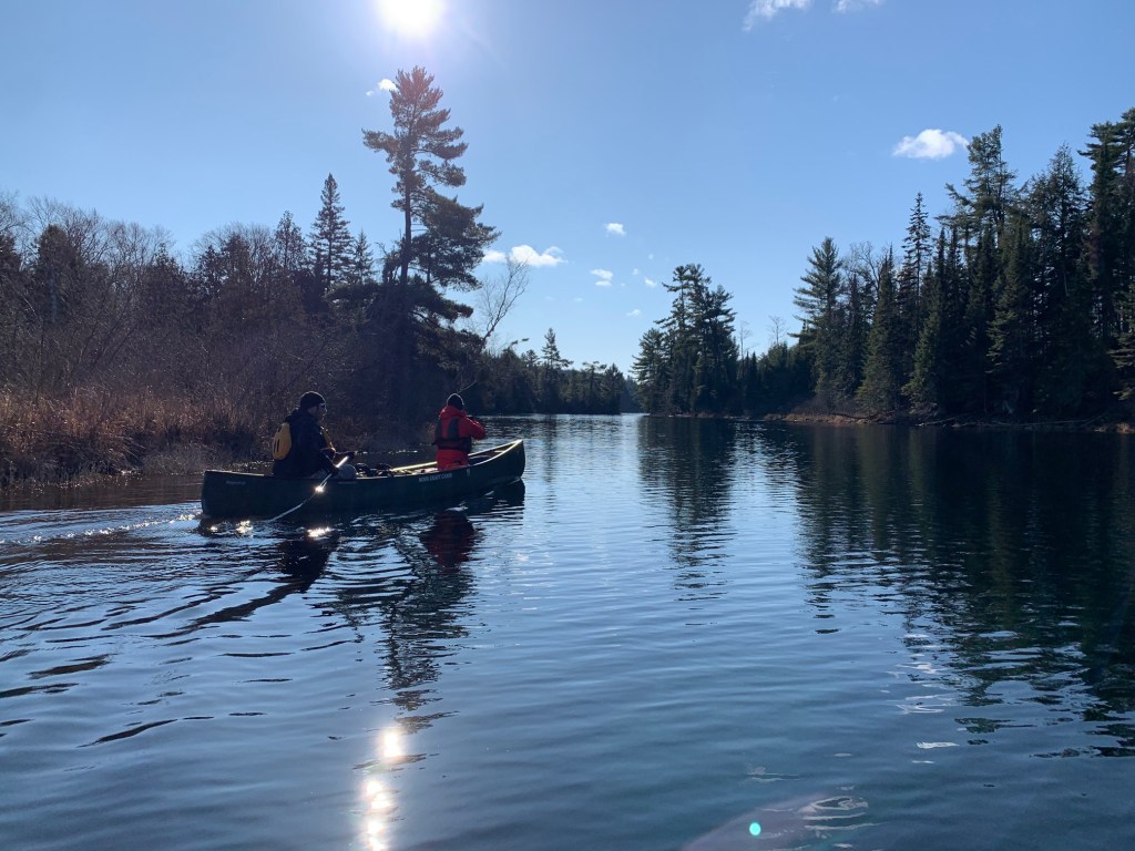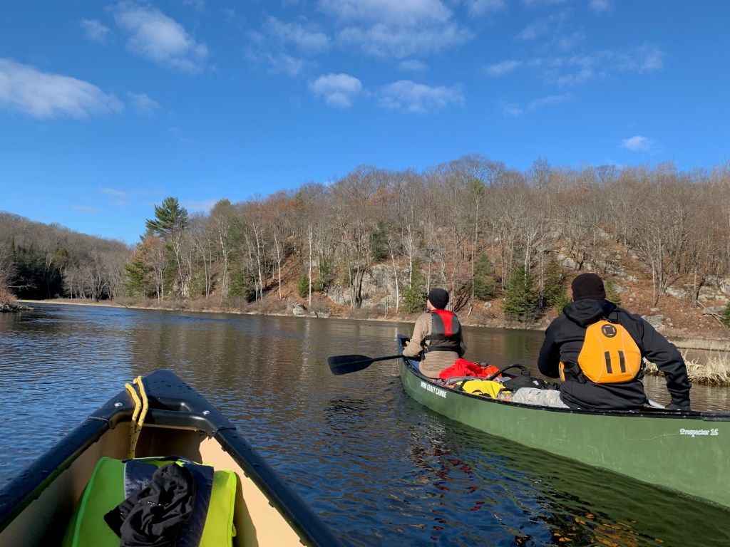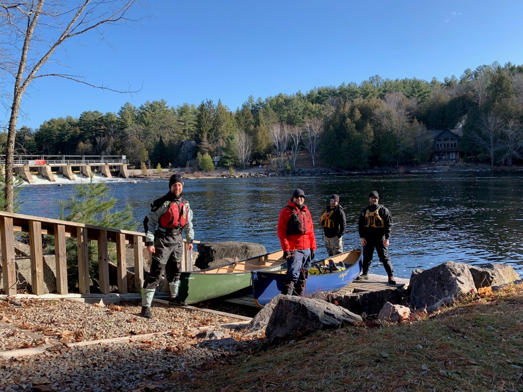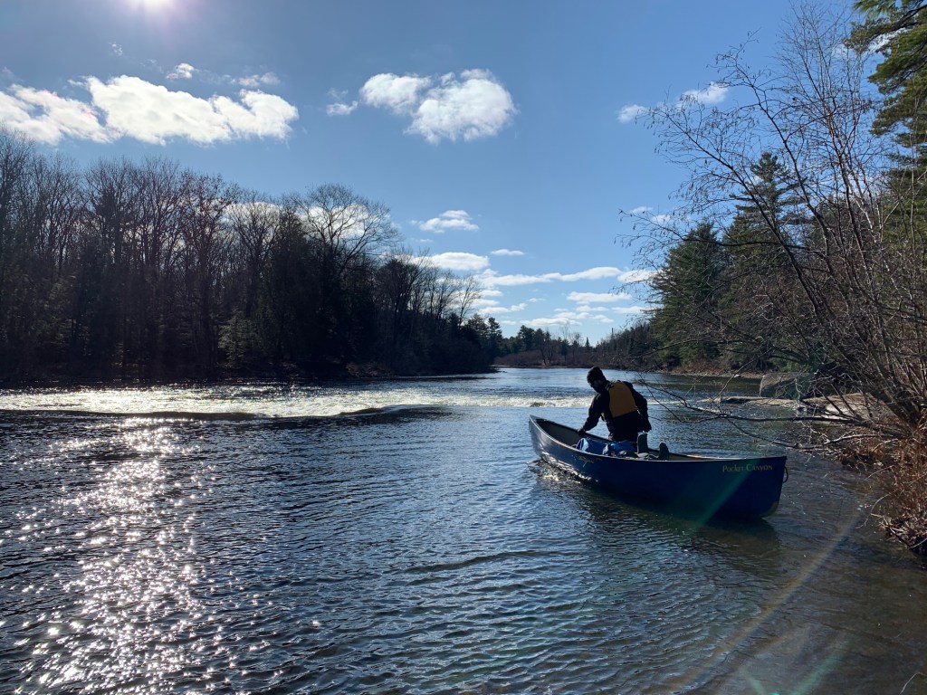After taking a few photographs by the Baysville dam, we were on our way with sunny skies above and an ambient temperature around freezing. Lachlan and I were particularly excited, as this trip marked the inaugural voyage of our new canoe, an Esquif Pocket Canyon, and we were hoping to try out this white-water tripping boat on a few of the rapids we knew we’d encounter.