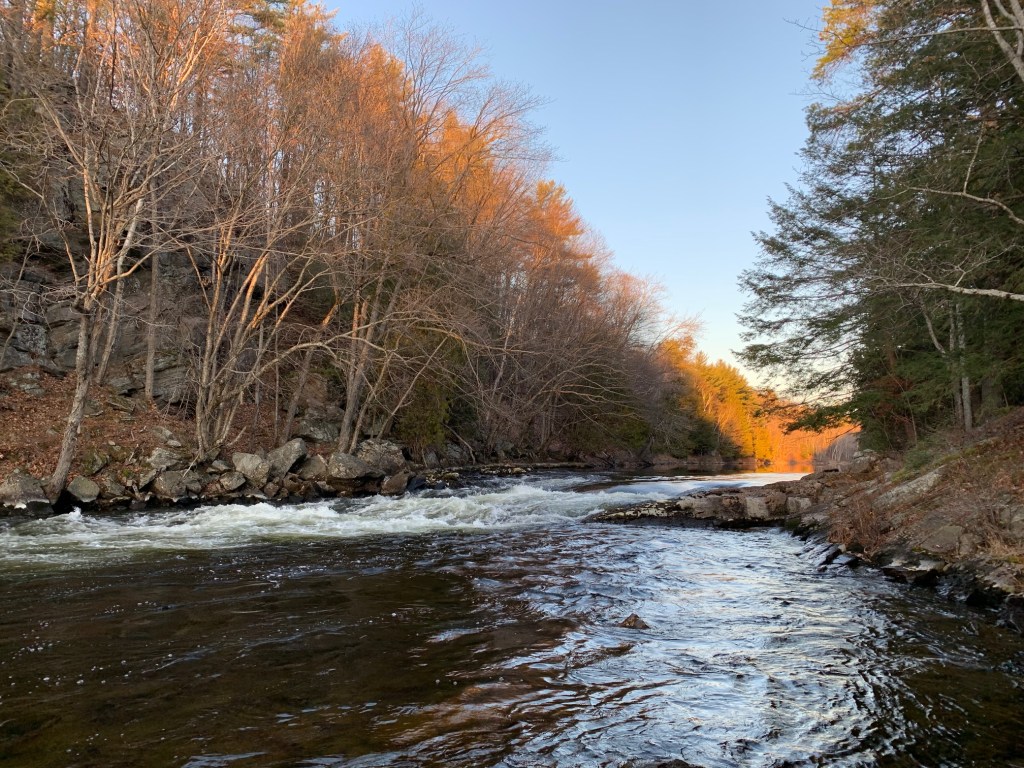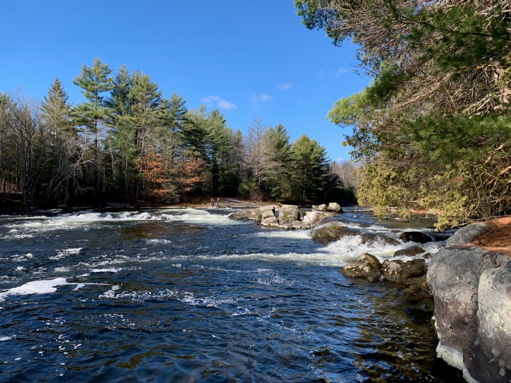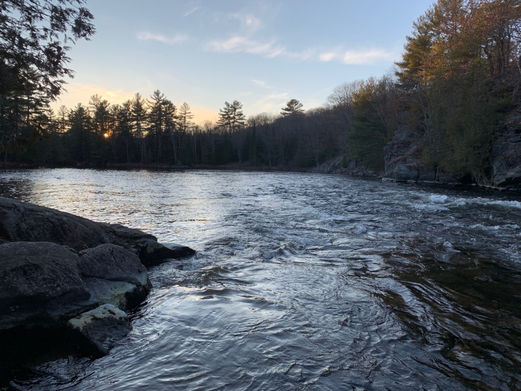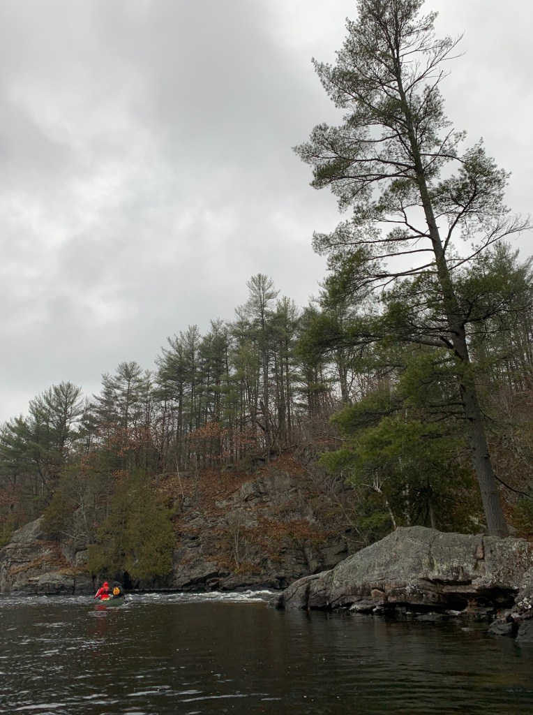 Beyond Thompson’s Folly we found ourselves paddling through picturesque Crown forests, with gently sloping, tree studded hills running up from the rocky shoreline on either side of us. By this time of the season, the splendour of the colourful fall foliage had long passed and in its place were barren deciduous trees, beige leaf litter on the forest floor, coating the hills, and long, dry, sun-bleached grasses along the riverside. We were now approaching Cook’s Falls, a scenic, gurgling CII rapids that lies in the shadow of a towering granite cliff – this would be our campsite for the night.