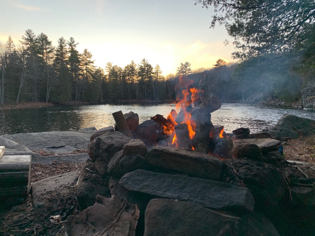 Dusk soon came and a pale, pastel sunset fell over our camp. We enjoyed a good fire and hearty meal and were visited by a family of mice which had made a home in one of the big white cedar trees behind us. Our good spirits were only (slightly) dampened with the knowledge that a cold, heavy rain was in the forecast for the morning.