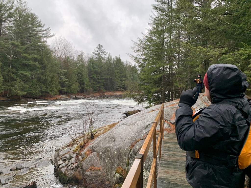 Down river from Cook’s Falls we came to Snake Chutes, a dramatic rapids that flows around a notch in the river. The rapids were clearly not runnable and we made quick work of the portage as the rain intensified. Cottages were again becoming more frequent along the edge of the river as we approached and bypassed our final obstacle at Slater’s Falls.