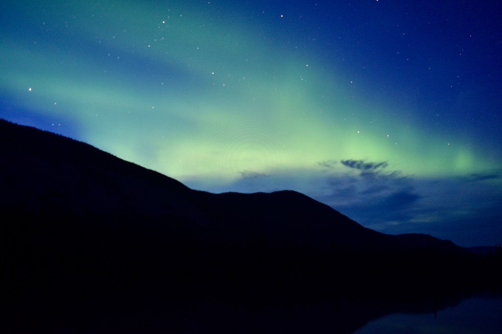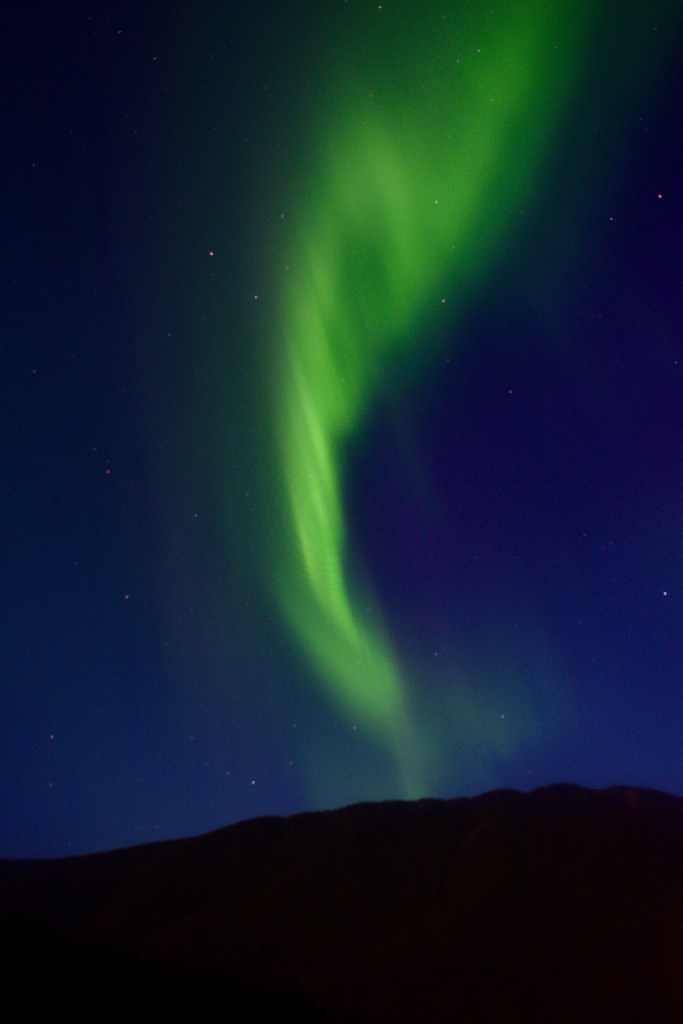 The spot provided a wide, mountainous panorama that yielded a beautiful orange sunset. The sunset was followed by the slow emergence of a broad carpet of stars, and the most incredible northern lights I had seen. At first, the lights faintly appeared over the distant mountains to our north before suddenly increasing in strength and flickering and pulsating over the sky. At one point the lights danced in a band of light that extended across the sky overhead from horizon to horizon.