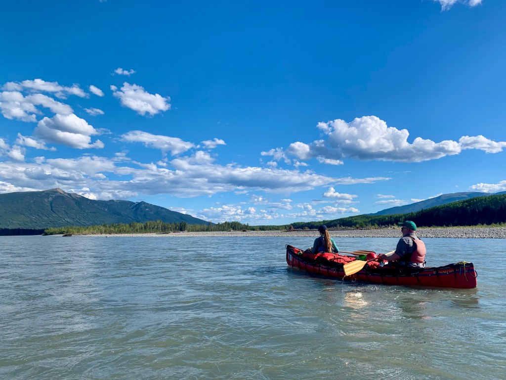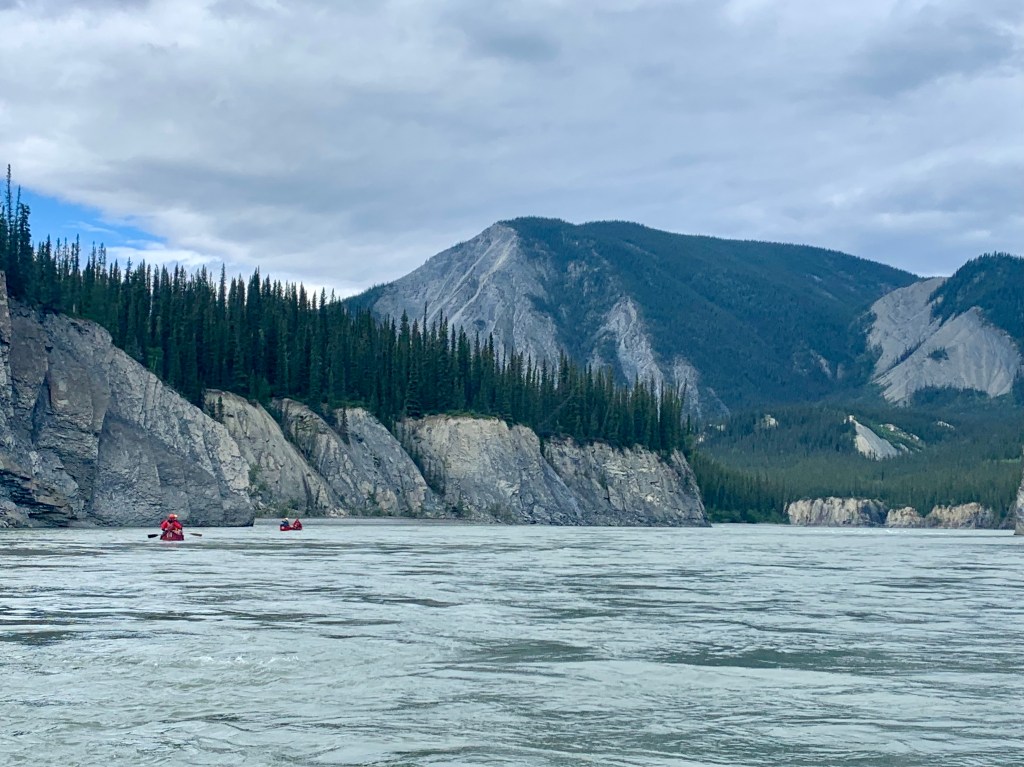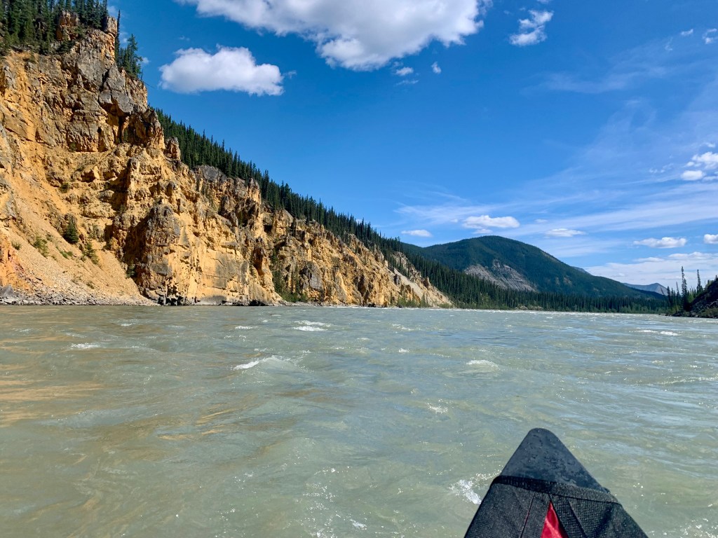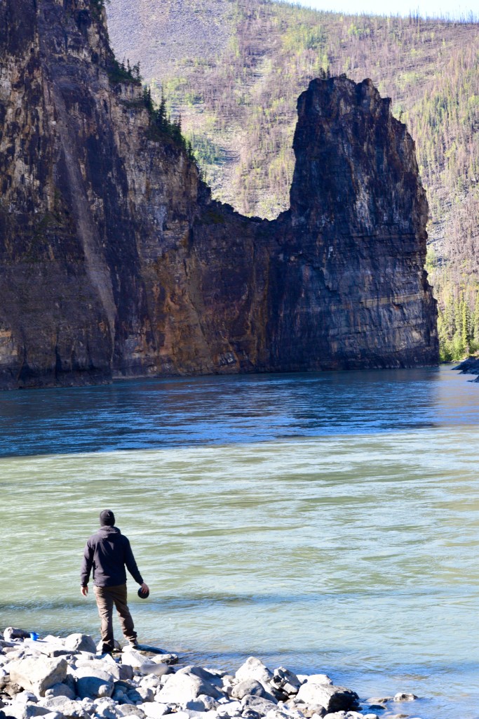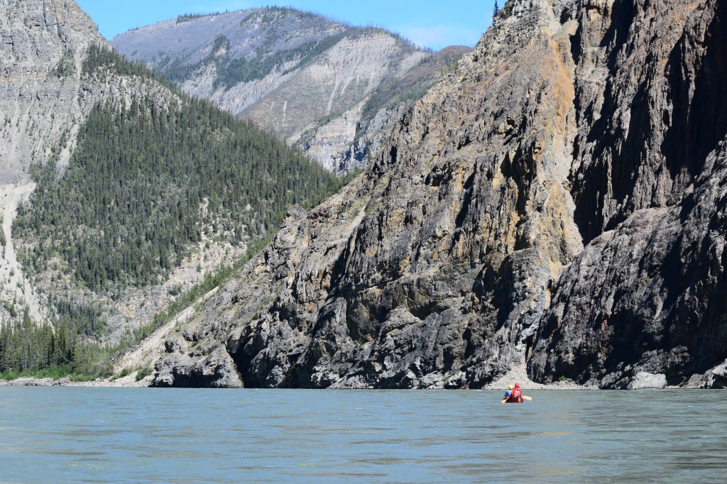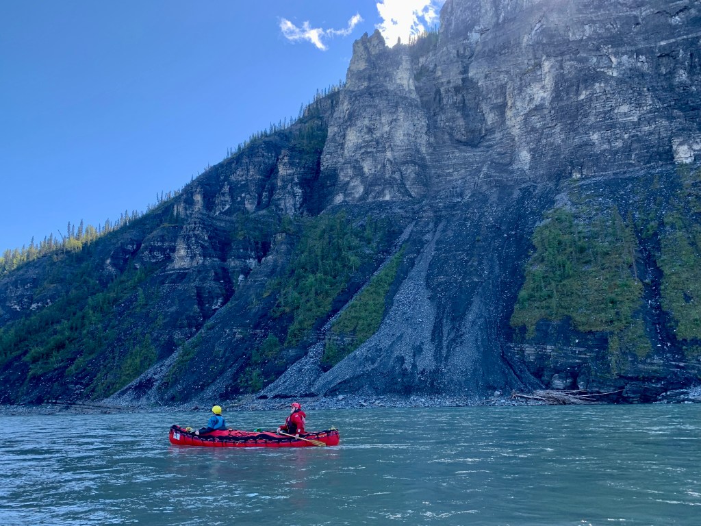 In the morning, we pushed off the edge of the Flat River and approached its junction with the Nahanni. It was fascinating to see the difference in the clarity between the two rivers and to watch the waters blend at the confluence; the Flat appears relatively clear while the Nahanni is opaque and extremely silty – so much so that it is possible to hear the silt hissing off the hull of the canoe as the boat glides through the water.