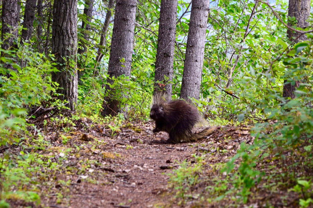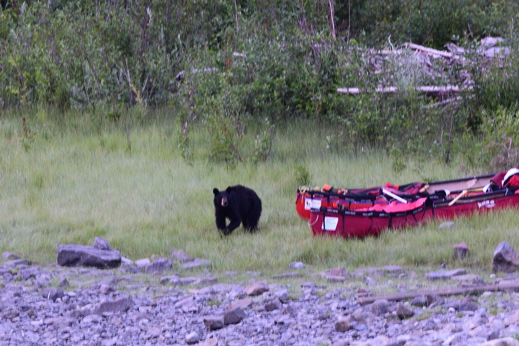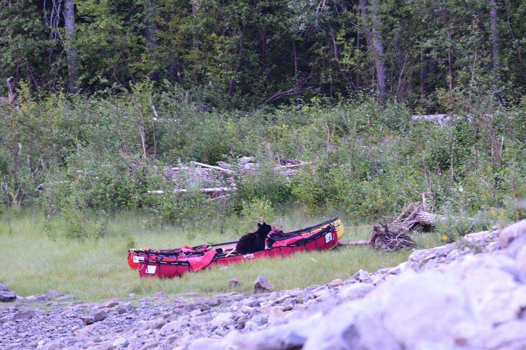 I emerged from my tent and peered down at the shore about 50 metres away to find a juvenile black bear sitting inside one of our canoes. Concerned for our spray skirts and other latent gear I started yelling at the bear, which in turn looked up and walked five or six steps toward me before stopping and gazing in my direction. I walked closer to the bear, shouting louder – by now everyone else had awoken and joined me wide-eyed at the shore, not knowing what to expect. Lachlan discharged a bear banger which hardly phased the creature. However, with some effort, our shouting did cause the bear to back off to the edge of the forest, where it continued to observe us. We approached the canoes and found that the bear had caused a seven inch tear in one of the spray skirts.