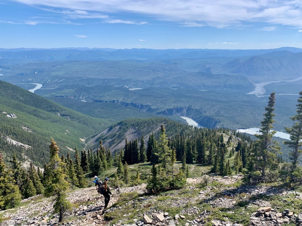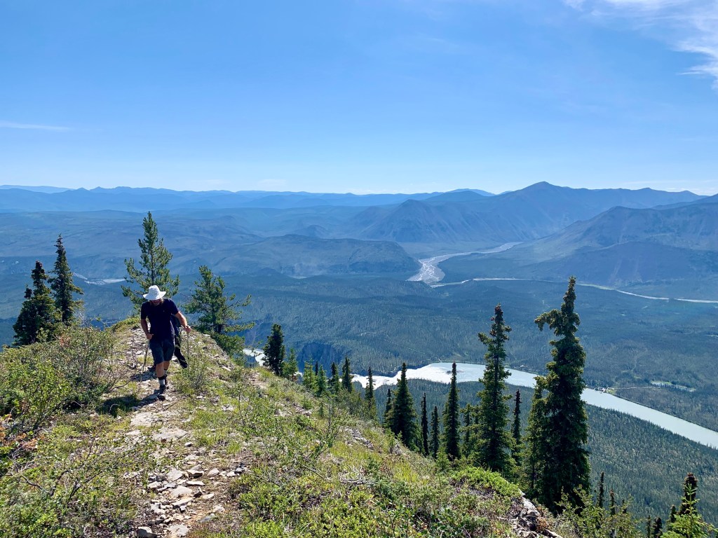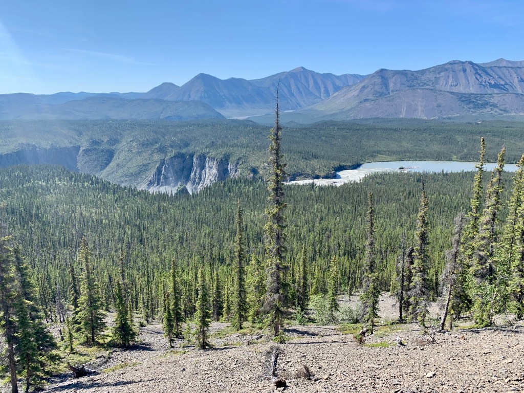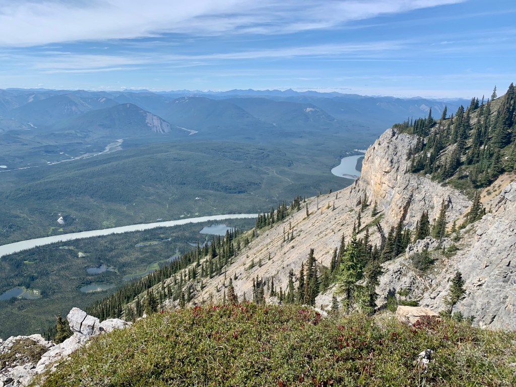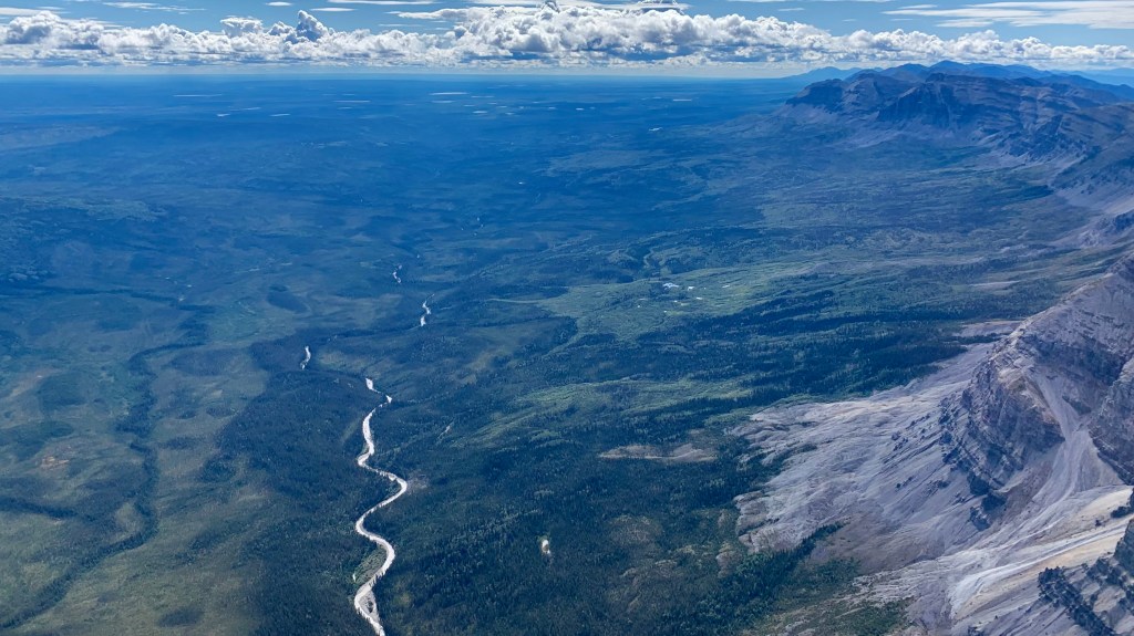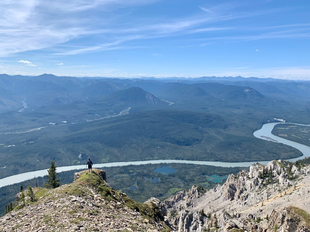 The view from the top is nothing short of stirring. From the distant northwestern horizon the Nahanni River winds its way through the mountain valley, past the camps along the western shoreline, over the brink of Virginia Falls and into the massive palisades of rock that characterize Fourth Canyon. To the southwest Marengo Creek shimmers as it lazily dances through the mountains to meet the Nahanni. To the southeast, a substantive, dominant ridge line can be seen stretching across the landscape, some 30 kilometres away; this represents the location of the Flat River – the largest tributary to the Nahanni and a storied waterway in its own right.
