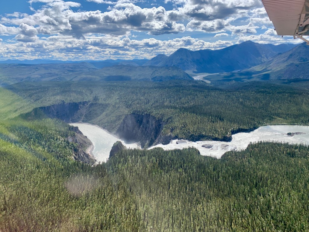 Late in the hour and a half flight, I found myself straining to glimpse the river I knew was ahead. Then suddenly, below us, in the distance, a wide chasm appeared to cut intently through the mountains, at its base a sparkling milky river – my first sighting of the Nahanni. Moments later, the rapids above Virginia Falls came into view; then the spray; then the frothing pinnacle of the falls, split by Mason’s Rock.