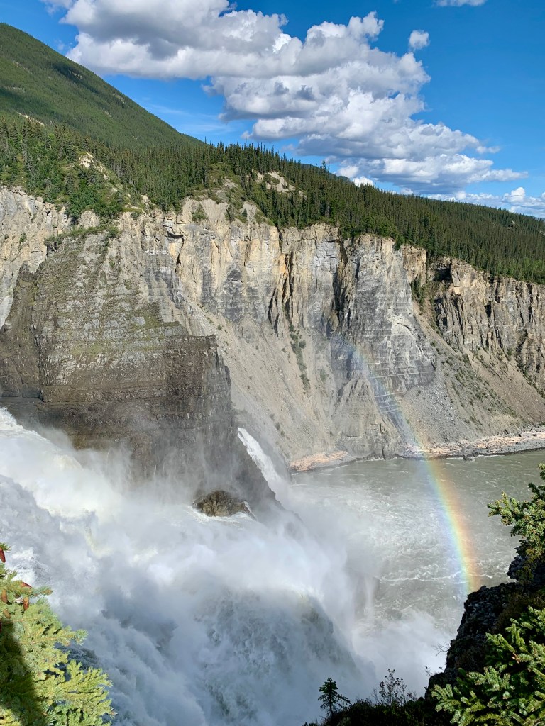 Above the falls, the relatively placid waters of the Nahanni rapidly transition into series of Class V and VI rapids as the river winds slightly to the east and then to the south before reaching the brink. Here Mason’s Rock defiantly divides the river in two, deflecting turbulent spray 40 or 50 feet into the air. When standing at the brink, the raw unfettered power of Virginia Falls – of the Nahanni itself – can be felt in your bones.