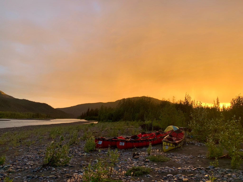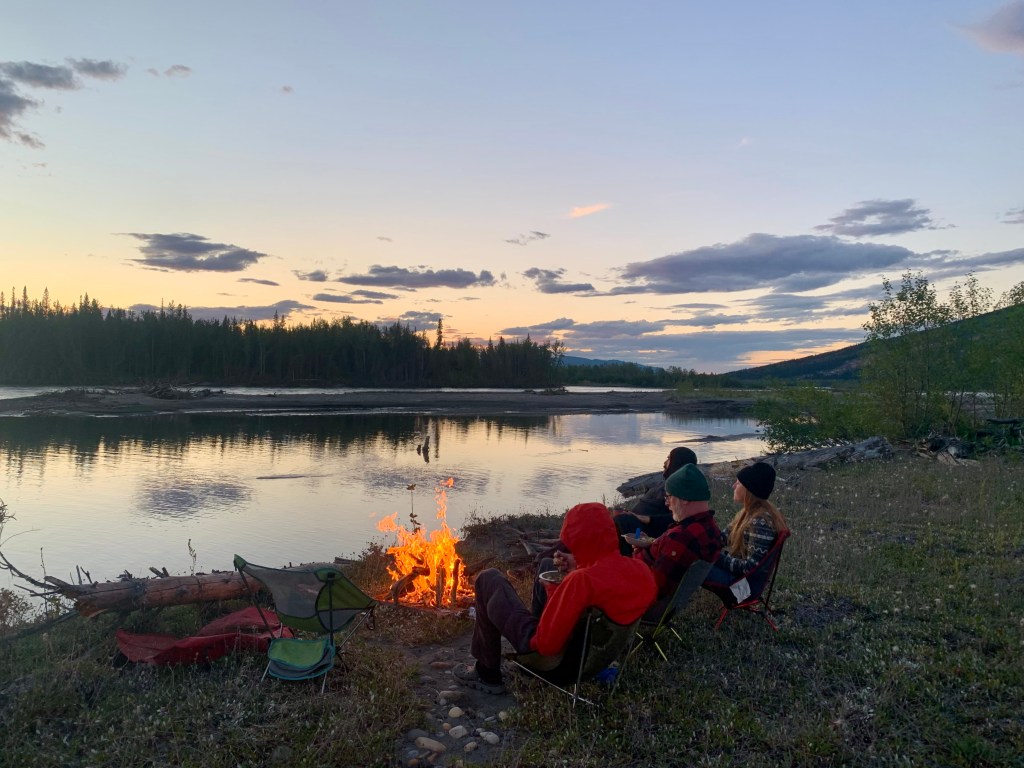 With reluctance we began the trip down the mountain and soon returned to camp. Here, as the sun set, parks staff treated us to bannock and Labrador tea, and told us of Dene traditions and games, showing us various artifacts made of bone, hide, and spruce root. We learned as well of the Dene’s historical methods of subsistence in this land, which relied heavily on large moose skin boats that were used to traverse the river to sustainably hunt and harvest food. We learned that the falls is sacred to the people, and that travellers have historically seen figures of powerful animals, such as eagles, dramatically emerging from its mists.