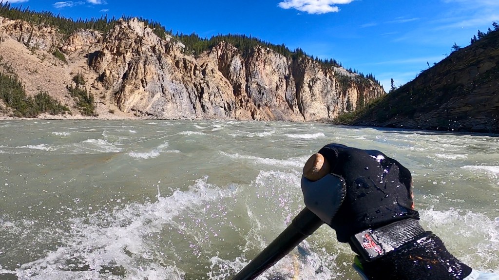 Onward past the blue, gurgling waters of Clearwater Creek, we soon arrived at Figure 8 Rapid, so named for the churning whirlpools here that form something that resembles the number “8”. Historically this rapid has had the nastiest reputation of any on the South Nahanni. In Raymond Patterson’s book “The Dangerous River” he describes the rapid as follows: “It was an amazing sight, though by no means designed to make the voyageur burst into any hymn of thanksgiving: it was Figure-of-Eight Rapid, the most dangerous bit of water on the lower river – now known as Hell’s Gate”.