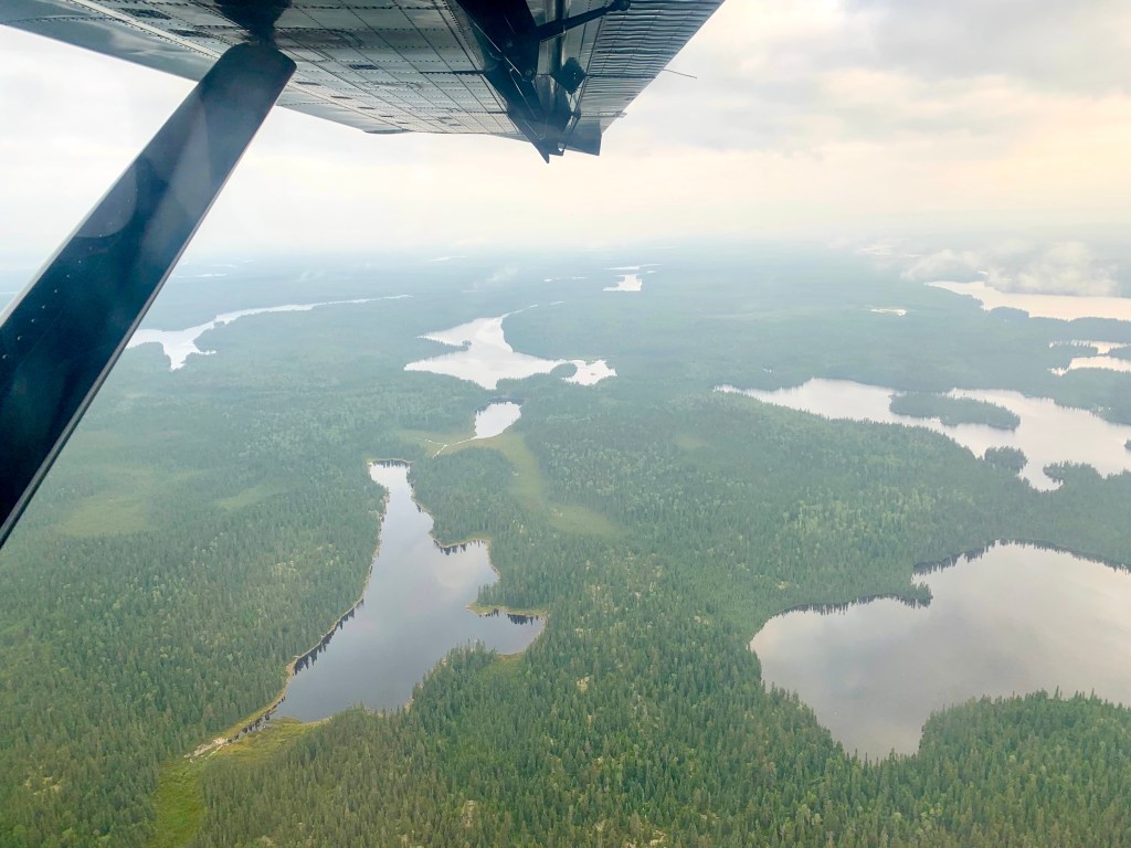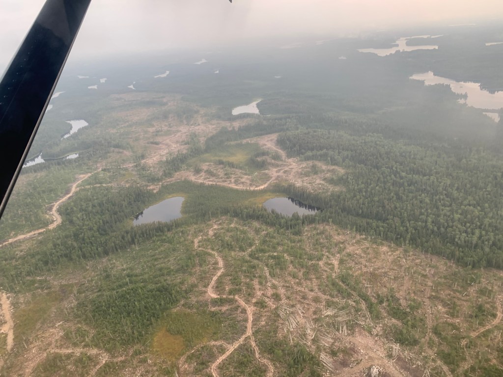 The sprawling greenery below us was, for a few brief moments, interrupted by large brown patches of disturbed earth – evidence of logging activity before the eastern edge of the park’s boundary. We also soon spotted a straight dark line cutting through the trees to the north as well. This, of course, was the Canadian National rail line that passes through southern extremity of the park. Following the path of the line over bogland, lakes and through vast stretches of forest, we were ultimately able to locate the spot along the tracks just north of Beagle Lake that we had used to access the Kopka system by train in 2017.