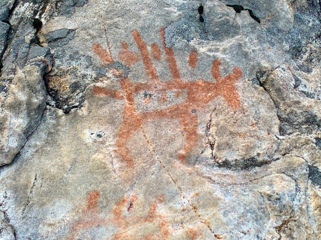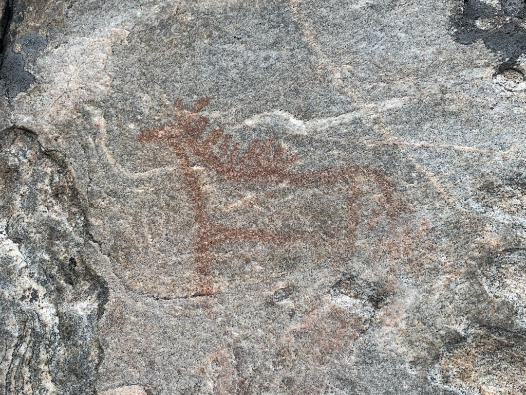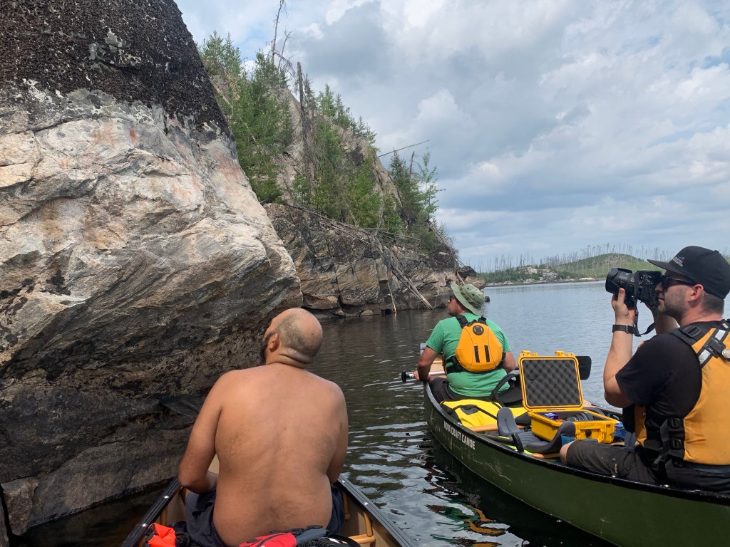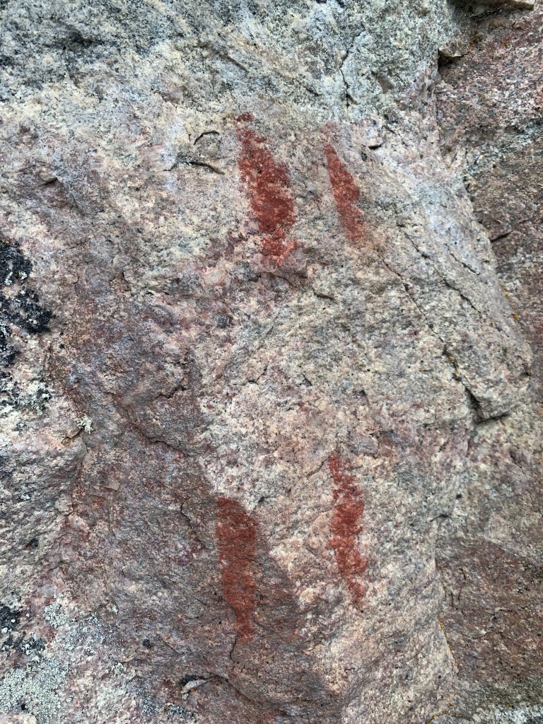 En route to Brennan Lake, we stopped at two pictograph sites. The first, found on a rock face near Stump Lake, included a series of caribou footprints, signifying the importance of the once bountiful caribou to the Indigenous populations of the area. We found the second site along the eastern edge of a rocky, dome-shaped island at the southwest end of Brennan Lake, amongst a landscape that had been devastated by fires in 2015. This site, adorned with bright purple fireweed that clung to face of the island’s granite wall, held pictographs of a caribou being hunted and various human figures of good quality.