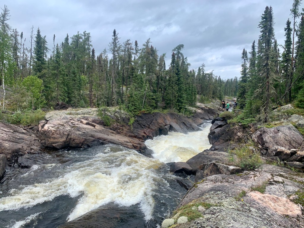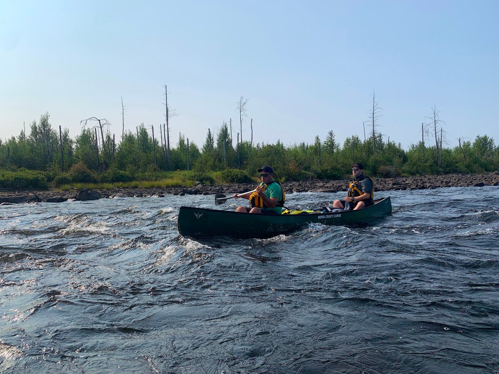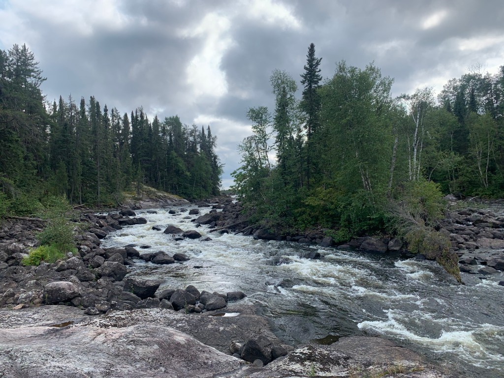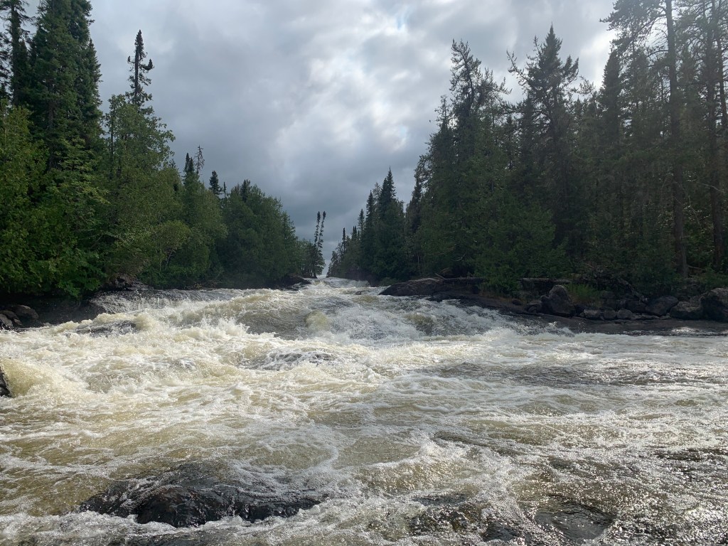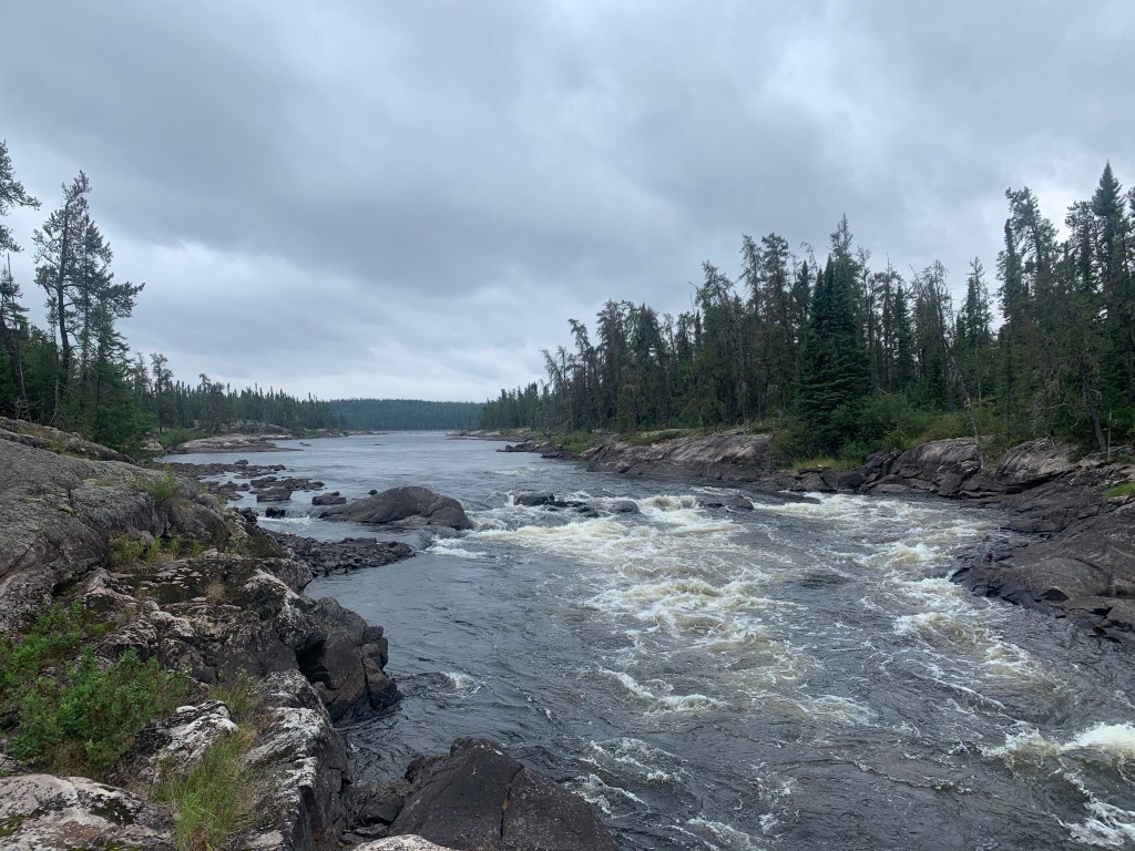 Past Kenoji, we paddled an additional series of rapids without issue, until a minor mishap occurred when Kevin and Lachlan’s canoe tipped on the exit of a tricky set. Wet, but not demoralized (though the skies were gloomy and the air cold), we continued on, completed a 400 metre portage through a burn, and soon officially entered the Ogoki River system.