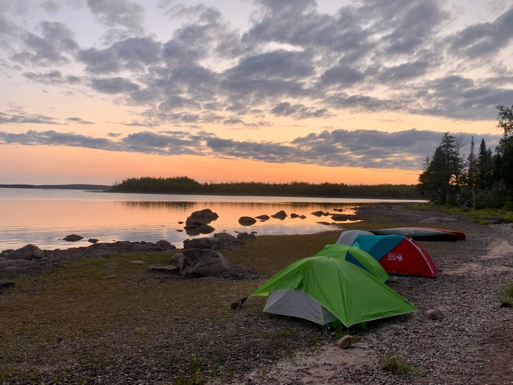 Further along, we portaged across a sizeable island in the middle of the river. Both channels around the island were entirely un-runnable with the south end characterized by a large, volumous and likely deadly waterfall. We had now travelled 27 kilometres on the day and thought our progress sufficient to pitch camp, which we did on a spit of flat granite on the river’s west shore, in earshot of the fall’s murmur.