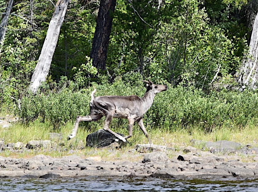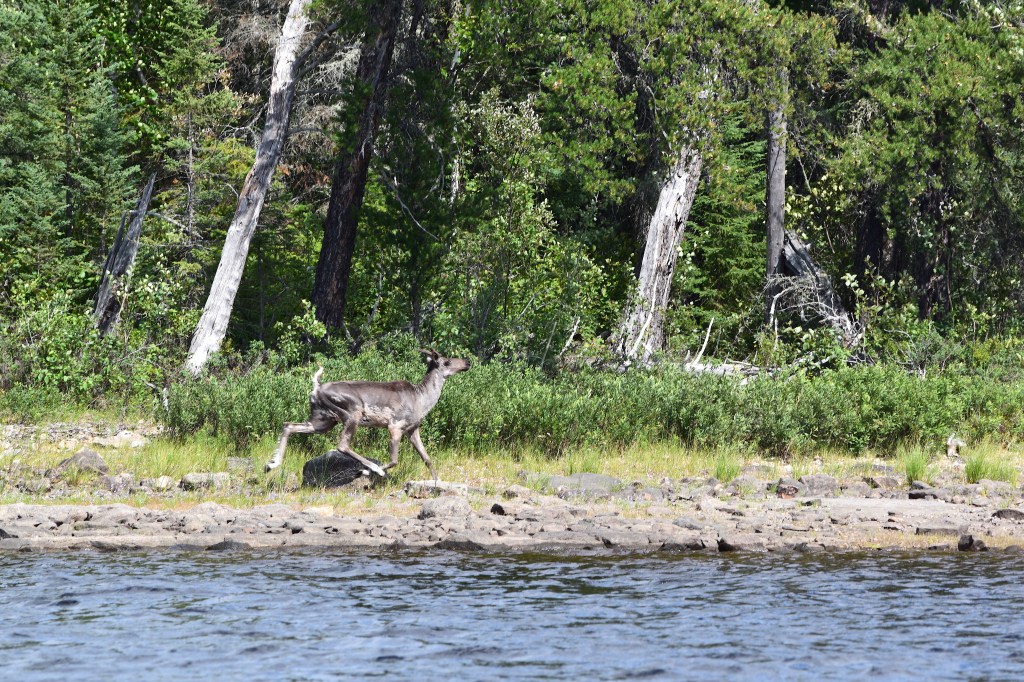 Beckwith’s cabins, situated on Best Island, were now less than two kilometres away, but as it happened, this was not the primary reward we received for our toil. On approach of the island, Jono spotted something swimming off the shore ahead of us. As we drew closer, we saw that it was a woodland caribou.