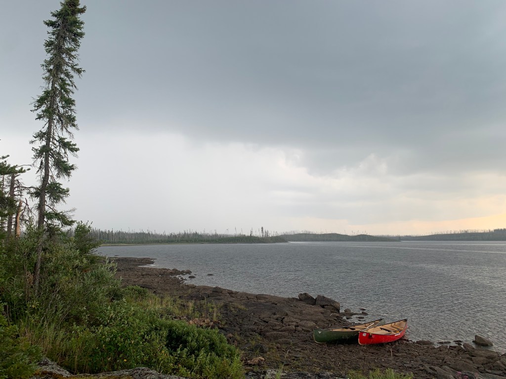 In the end we found respite at the far southeastern shoreline of the lake at a jack-pine shrouded campsite that appeared to have been derelict for decades. Amongst strong, whirring winds and a late evening drizzle, we nervously wondered what the next day would bring.