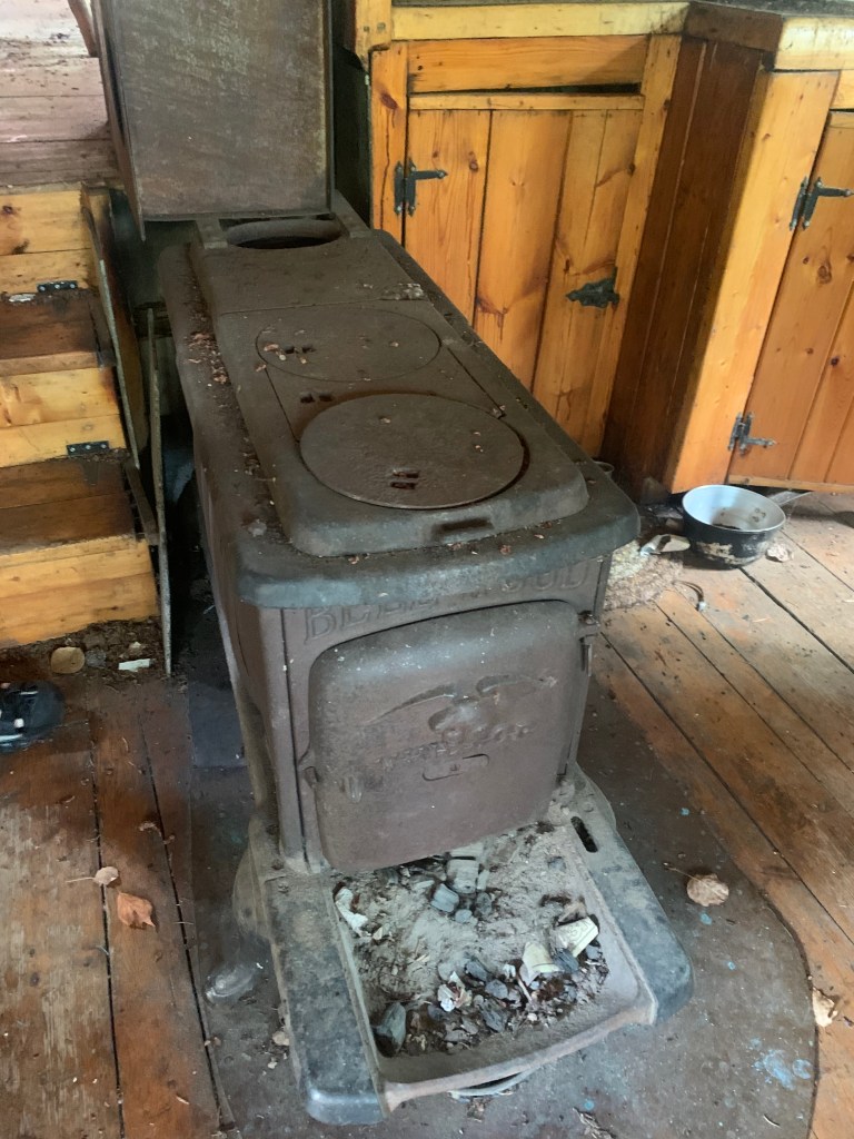 In the afternoon we came upon a dilapidated trappers’ log cabin that we briefly explored. The front side of the building was the only part that remained in tact. Its facade leaned aggressively backwards and away from the river, propped up by its decaying side walls. A collection of old rusted artifacts – cooking pots, pans, a bed spring – remained inside. Soon this site would be fully reclaimed by nature – akin to the seemingly inevitable fate of the Beckwith cabins that we would encounter later in our journey.