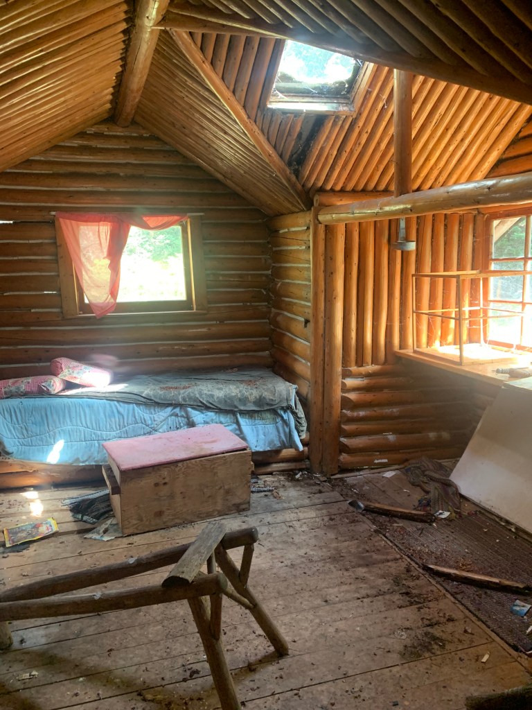 Beckwith’s hermitage contains five log structures (three cabins, a shed and an outhouse), all of which we found to be in varying stages of decay. The main cabin, which was the first cabin built in the early 1960s and was Beckwith’s initial refuge, had in recent years collapsed entirely in on itself. The guest cabin, and second one to be built (in the late 1960s), remained in the best condition with little structural damage. The cabin was mostly used by Rose Chaltry, who lived on the site and assisted Beckwith periodically over several years in the 1970s. Though the contents of the building, which included a mattress, old mugs, cookware, lanterns, books and faded National Geographic magazines, were scattered in disarray, they helped to provide a real conception of how life would have been here 50 years ago.