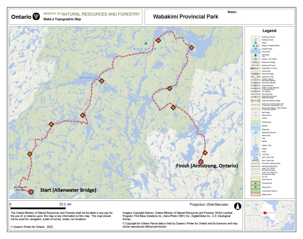 Acknowledgment: Planning and execution of this adventure relied heavily on the advice and expertise of Bruce Hyer of Wabakimi Outfitters. We also relied on information provided through the community, including incredibly detailed trip information available at <https://albinger.me>.